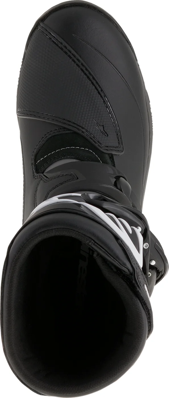 • Partea superioară a cizmei negre din piele acoperită cu poliuretan (PU) pe panoul medial inferior și piele de căprioară pe panoul medial superior, ambele cu textură presată la cald pentru aderență superioară