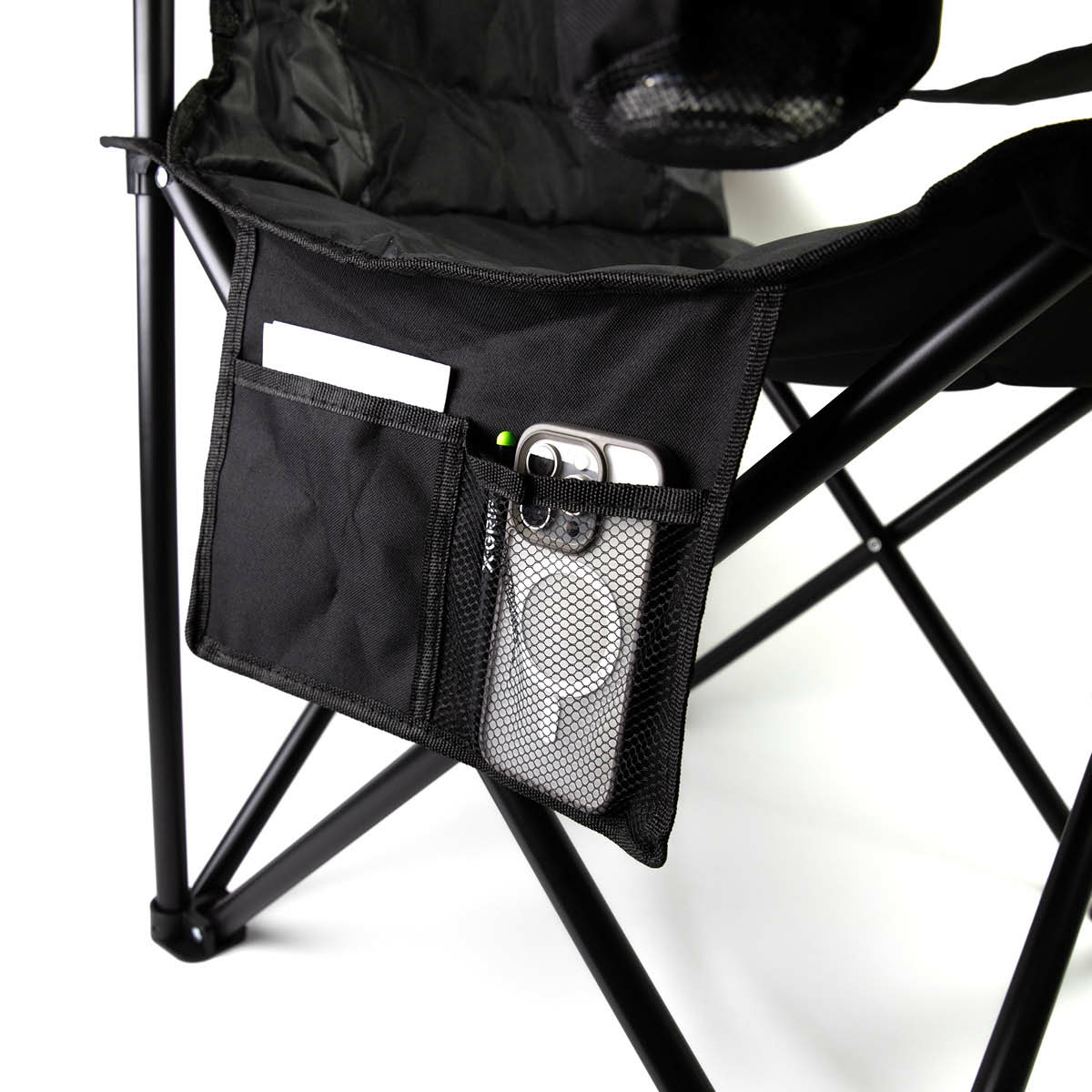 Scaunul de camping X-GRIP oferă confort maxim și caracteristici practice pentru orice utilizare în aer liber. Cu scaunul său foarte lat, scaunul oferă confort optim chiar și după zile lungi de curse. Scaunul, cotierele și spătarul sunt fabricate din poliester rezistent, ceea ce îl face perfect pentru utilizarea dură în aer liber. Un suport integrat pentru băuturi asigură că băutura dvs. este întotdeauna la îndemână, în timp ce buzunarul lateral de depozitare cu două compartimente oferă spațiu pentru unelte sau obiecte personale. Scaunul este fabricat din metal rezistent și impresionează prin robustețea sa. Datorită mecanismului practic de pliere, acesta poate fi pliat rapid și transportat convenabil în geanta de transport cu curea de umăr furnizată. Sigla X-GRIP marcantă de pe față și spate subliniază aspectul sportiv. Scaunul de camping X-GRIP este combinația perfectă de confort, funcționalitate și stil - ideal pentru utilizarea în paddock sau la camping.
