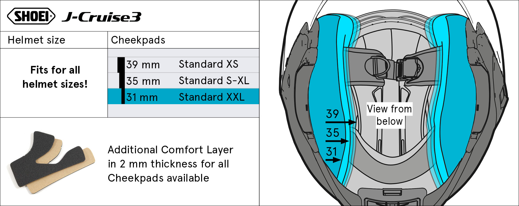 Cu pernuțele noastre de obraz poți înlocui căptușeala originală a căștii tale. Sau poți folosi o pernuță ușor mai groasă sau mai subțire pentru o ajustare individuală. Pernuțele de obraz ale unui model de cască sunt interschimbabile în toate mărimile disponibile, așa cum se arată în tabelul de mai jos.