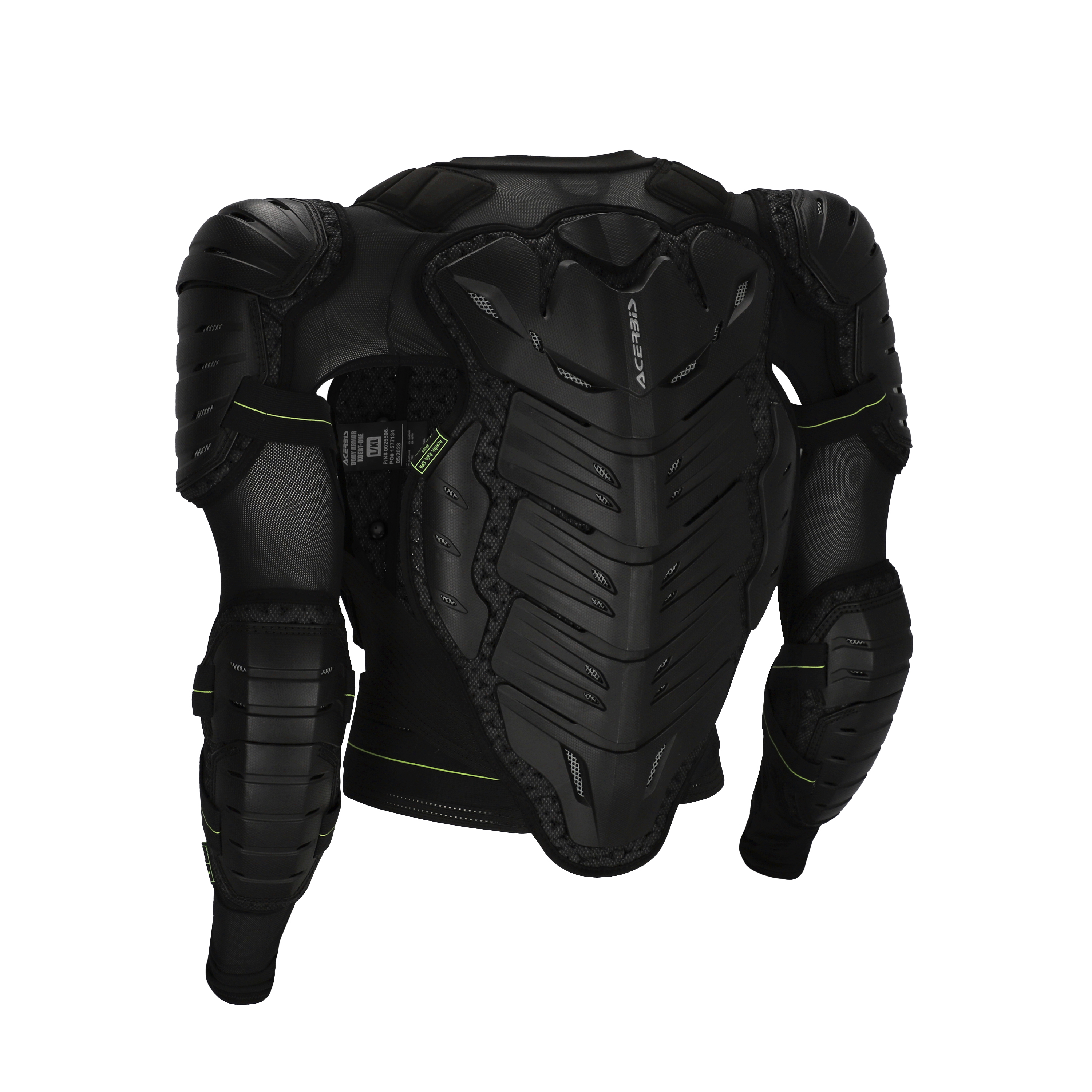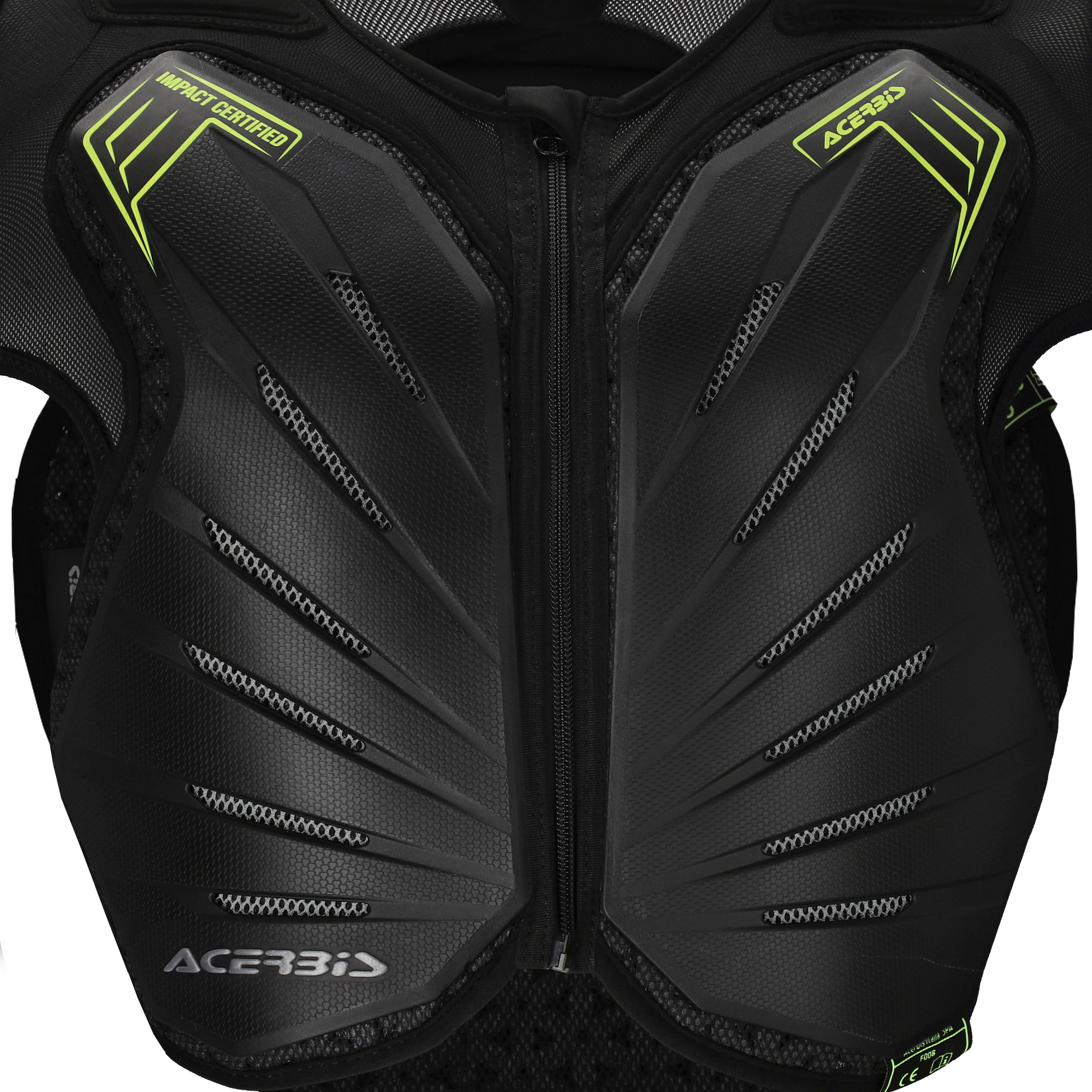 - Detalii Tehnice: Inserții cu logo Acerbis pe panourile rigide și etichete de omologare integrate sub protecțiile de piept spate umeri și coate