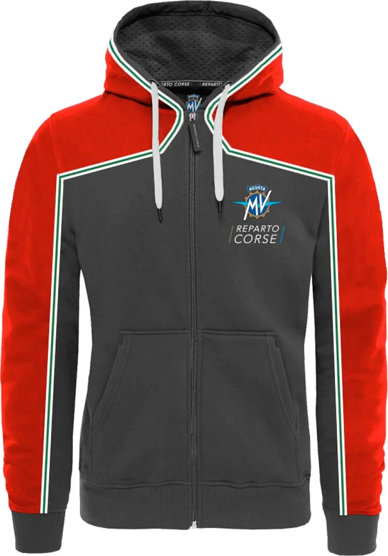 The Reparto Corse Hoodie Full Zip by MV Agusta is a stunning hoodie featuring embroidered MV Agusta and Reparto Corse logos on the front and back. The zipper is covered by a rubber puller with the Reparto Corse logo. The hood consists of a mesh inner and the metal lace closures come with a Reparto Corse lasered logo. White and green piping added for contrast.